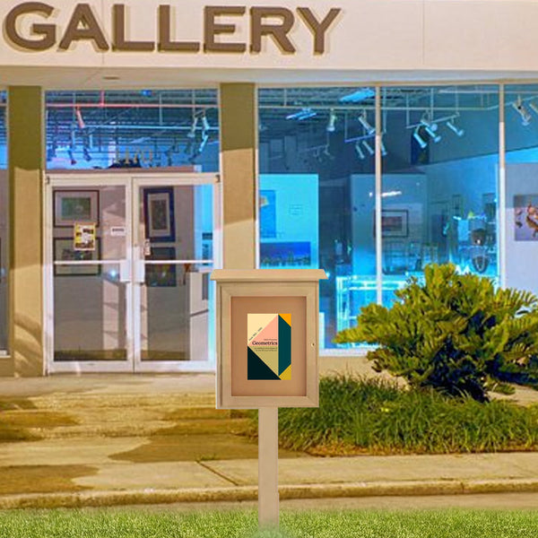 The mini 11" x 14" outdoor enclosed bulletin board, single door with a single post, features a solid continuous left-sided hinge allowing the outdoor information board to open and close easily. A front CAM Lock and break-resistant clear Acrylic window help protect the message display board.