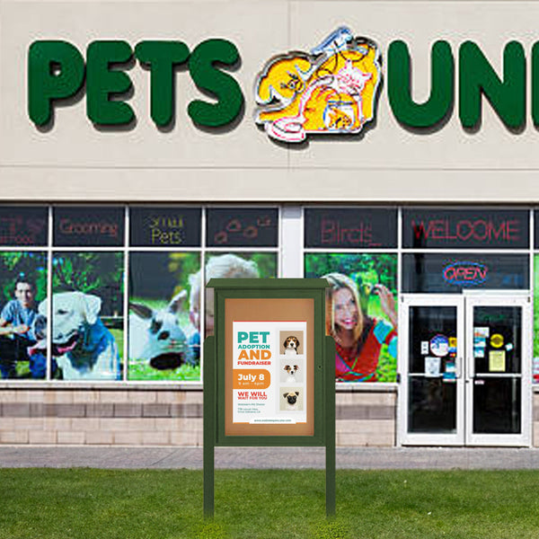 With its Weather Resistant Bulletin Board Cabinet construction and standing tall on two 10 foot leg posts, this 30x40 Outdoor Message Center is ideal for numerous exterior locations including Camps, University Campuses, School Grounds, Hiking Trails, Parks, Zoos, Botanical Gardens, County Fairs, Restaurants, Community Centers and any other location in need of a Outside Enclosed Information Board.
