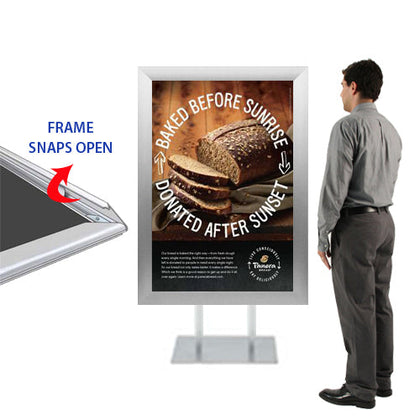 Displaying your 40x60 poster, sign or graphic makes the double pole floor stand a snap to use when it comes to updating your printed insert. It features quick changing, 40x60 snap frames.