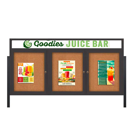 Free Standing "SwingCases" Lighted 3 Door Enclosed Bulletin Boards with Message Header are built for all kinds of outdoor locations. With an overall display case depth of only 3 1/8 inches, the lockable display boards are ideal for outdoor public areas.