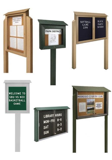 Our growing list of floor standing display fixtures include; indoor and outdoor display cases, enclosed bulletin boards and cork bulletin board stands, menu case stands, changeable letter boards, sign stands, multi panel poster displays, dry erase boards, poster racks, literature displays, print bins, art displays, exhibit panels, A frame sidewalk stands and banner stands – and numerous other sign holders and floor stand displays for outdoor and indoor use.