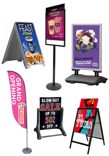 Besides our ever-expanding Swingframe product lines we are working with select display manufacturers and vendor partners, to offer you a broader range of quality indoor and outdoor signage stands, poster display stands and other freestanding display fixtures. If you have a question, or can’t find the right display or stand, call our helpful customer service.