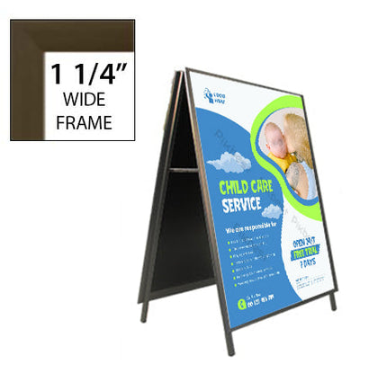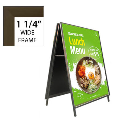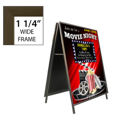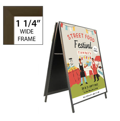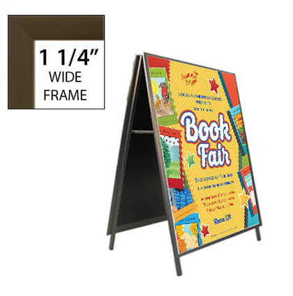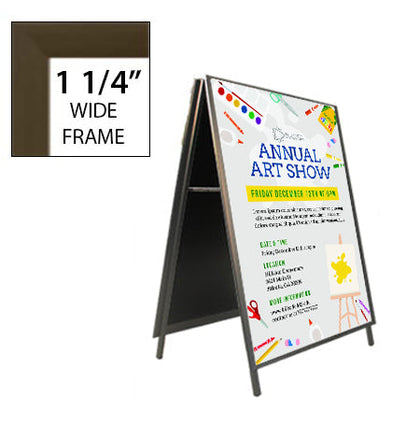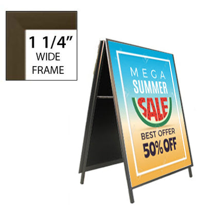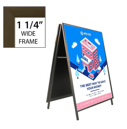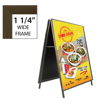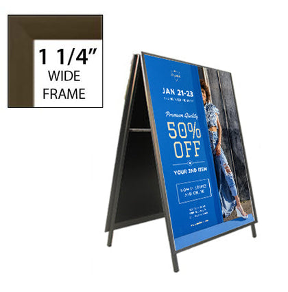 Make a bold impression with a 2 1/2" wide A-frame poster holder. These wide frames help call attention to your advertisement in an eye-catching way. Make your graphic stand out when you choose from a black, silver, gold, or faux cherrywood frame finish. No matter your choice, the wide frame will keep the spotlight on your display.