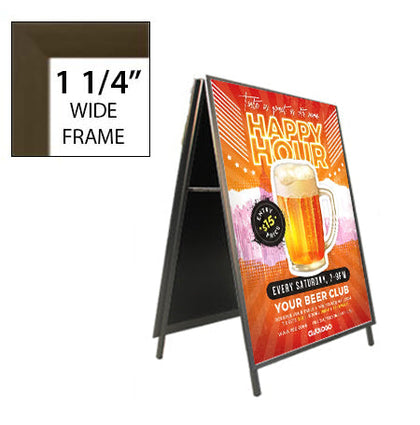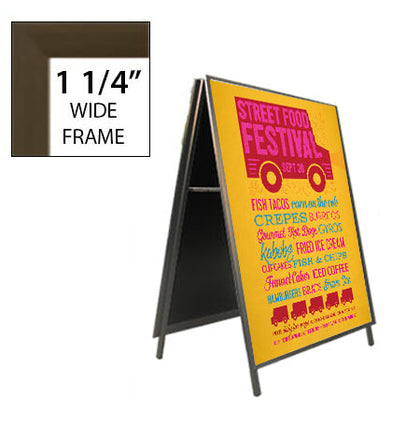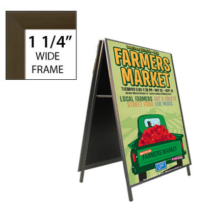 Browse 1 1/4" wide snap-frame metal and wood A-frame signs for a classic display. Your poster is the center of attention with no bulky frames. Waste no time updating your signage! Changing your graphics is painless; snap open the frame sides and replace your poster whenever you desire. Mitered and radius-style corners make these signs safe for busy areas. Choose from satin black; satin silver; satin gold; polished silver; polished gold; powdercoat white; powdercoat blue; powdercoat bronze; or powdercoat red metal finishes.